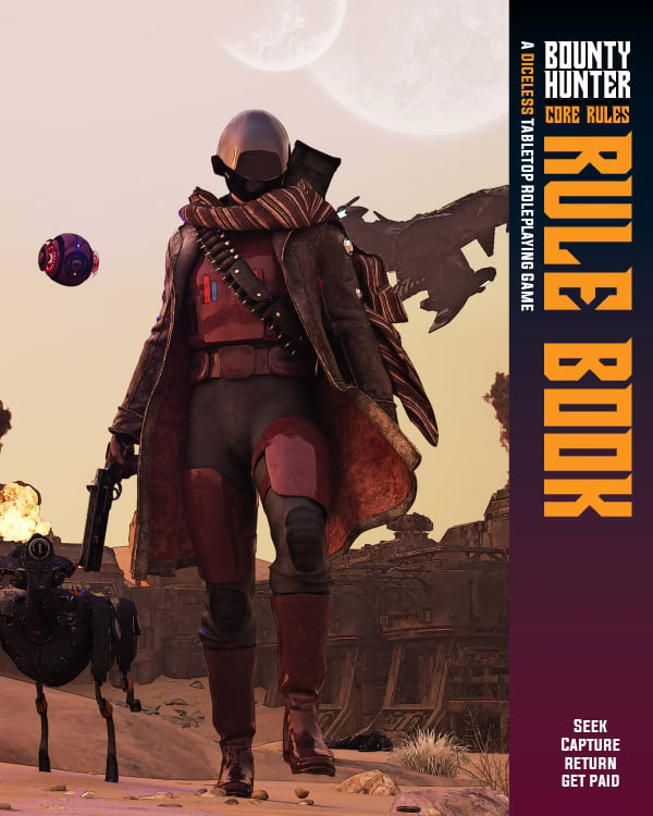 The rules are designed in such a way that this Bounty Hunter TTRPG can be played with ZERO BOUNTY HUNTERS and is also an awesome Sci-Fi TTRPG system. Wanna run Galaxy Journey? Galaxy Conflicts? Warsun Universia? A large open space that expands for a long way? It’s all here.
