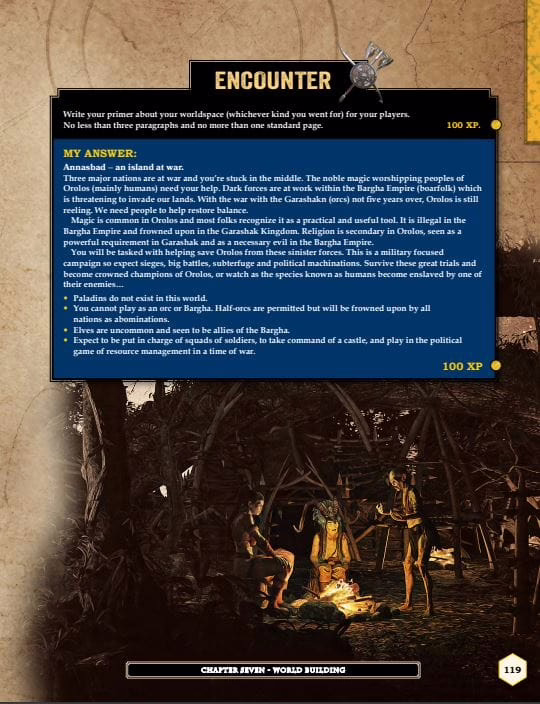 Now, this isn’t just a load of theory, mind you. “The Practical Guide to Becoming a Great GM” is meant to be exactly that: practical. Every chapter includes at least one or two tasks, which we’ve called “encounters,” that you can actually complete. These are designed to help you really embed the ideas and principles of the book into your own personal method for preparing and running your games. Think of them as little exercises to flex your GMing muscles.