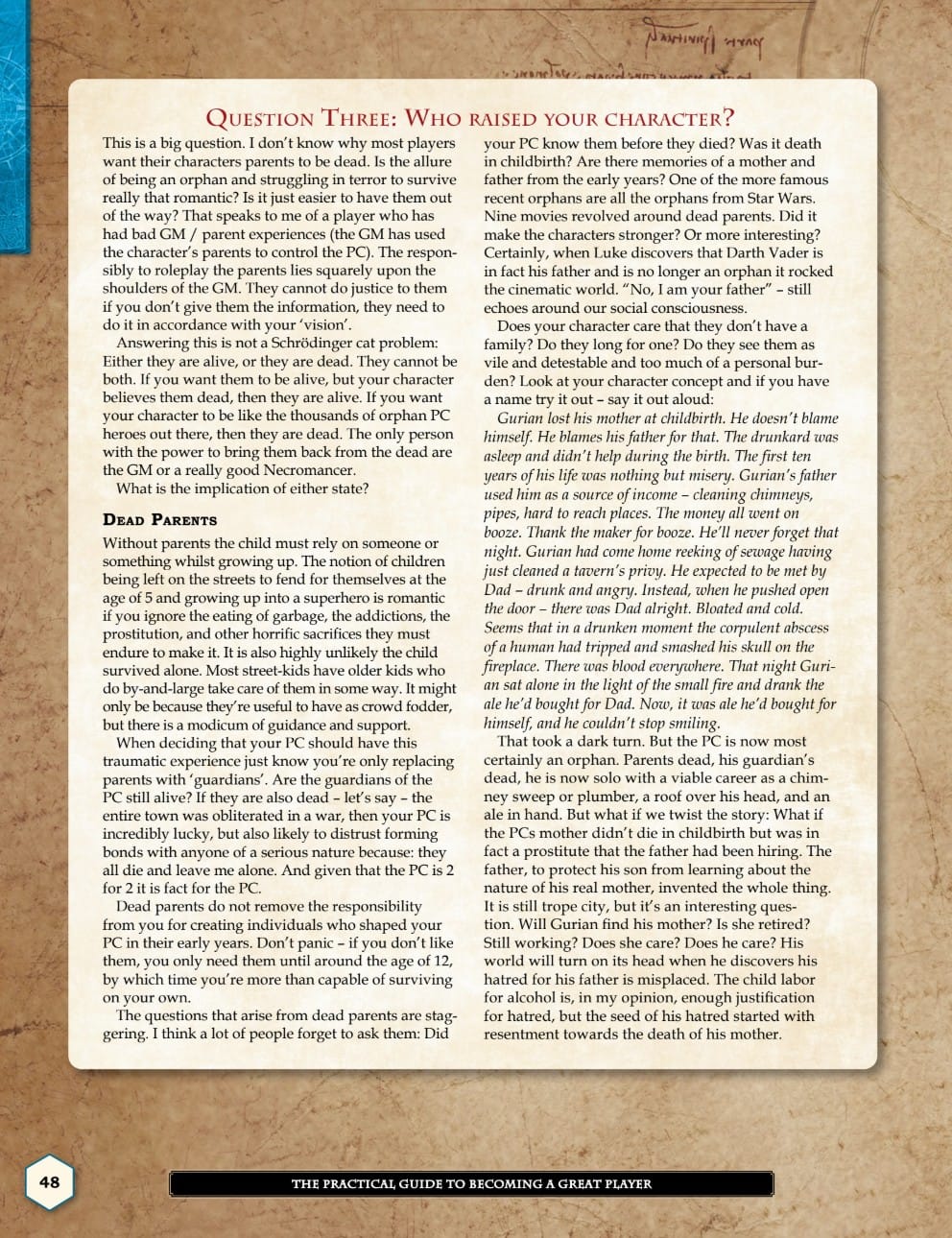 Understanding your character, and bringing them to life with a few simple questions and some tinkering, that mechanics should guide not constrain, and that something as unremarkable as the smell of your character can be game changing,