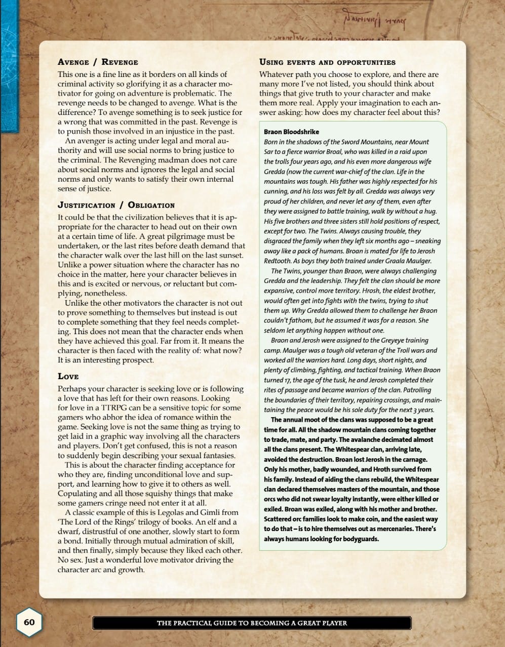 Packed full of content including personal insight from some of the top players and game masters in the world, this book is as good as it gets when it comes to upping your gaming experience as a player. Dozens of reference tables, random tables, and generators support your journey, and will continue to be useful for the rest of your gaming career.